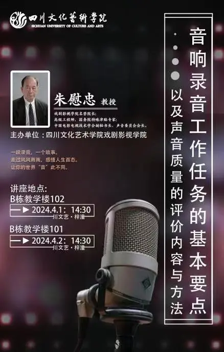 为扎实推进科研、教学工作更上台阶,促进师生的专业化成长,4月1日至2日,四川文化艺术学院戏剧影视学院邀请学院名誉院长、高级工程师、国务院特殊津贴专家、中国电影电视技术学会副秘书长、声音委员会会长朱慰忠教授来校进行《音响录音工作任务的基本要点以及声音质量的评价内容与方法》的专题讲座。学校戏剧影视学院录音艺术专业全体师生聆...